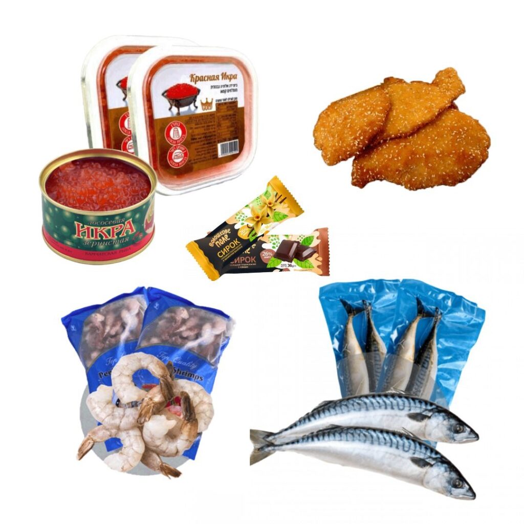 Красная икра двух видов, глазированные развесные сырки Волошкове поле, креветки Джамбо, скумбрия свежемороженая, шницели в панировке.